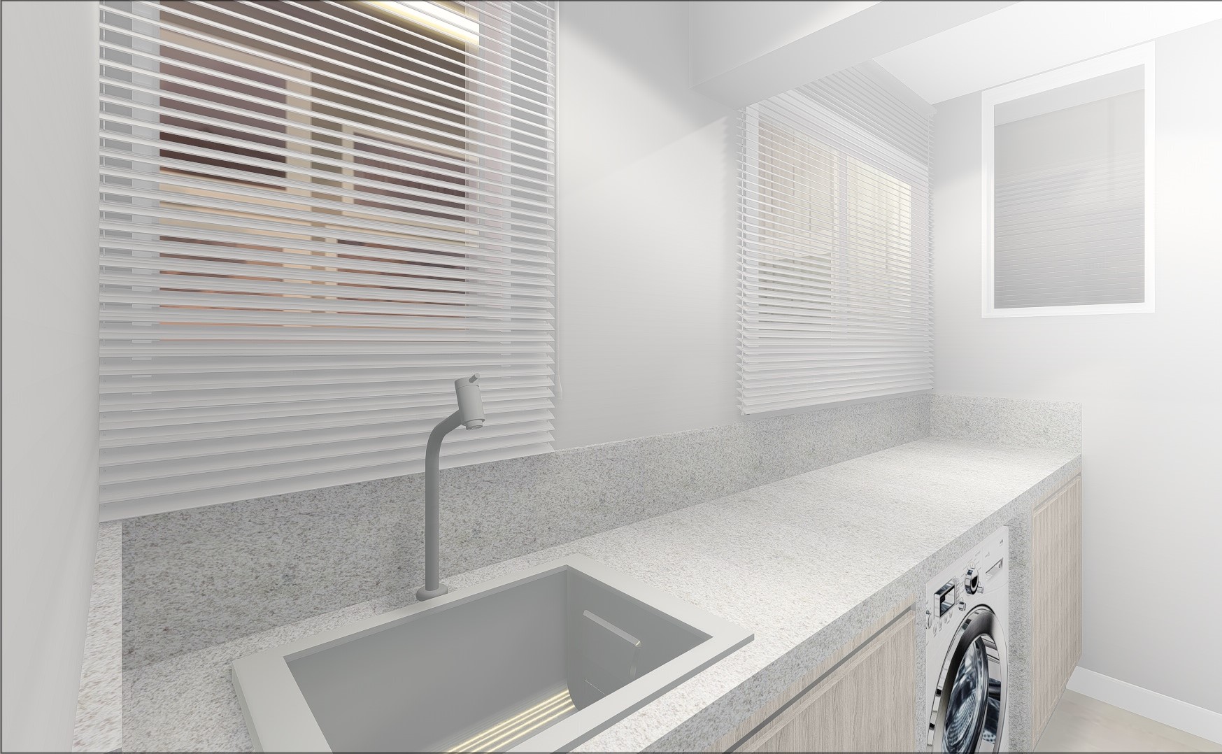 Tanque embutido super discreto e máquina lava e seca sob o tampo.