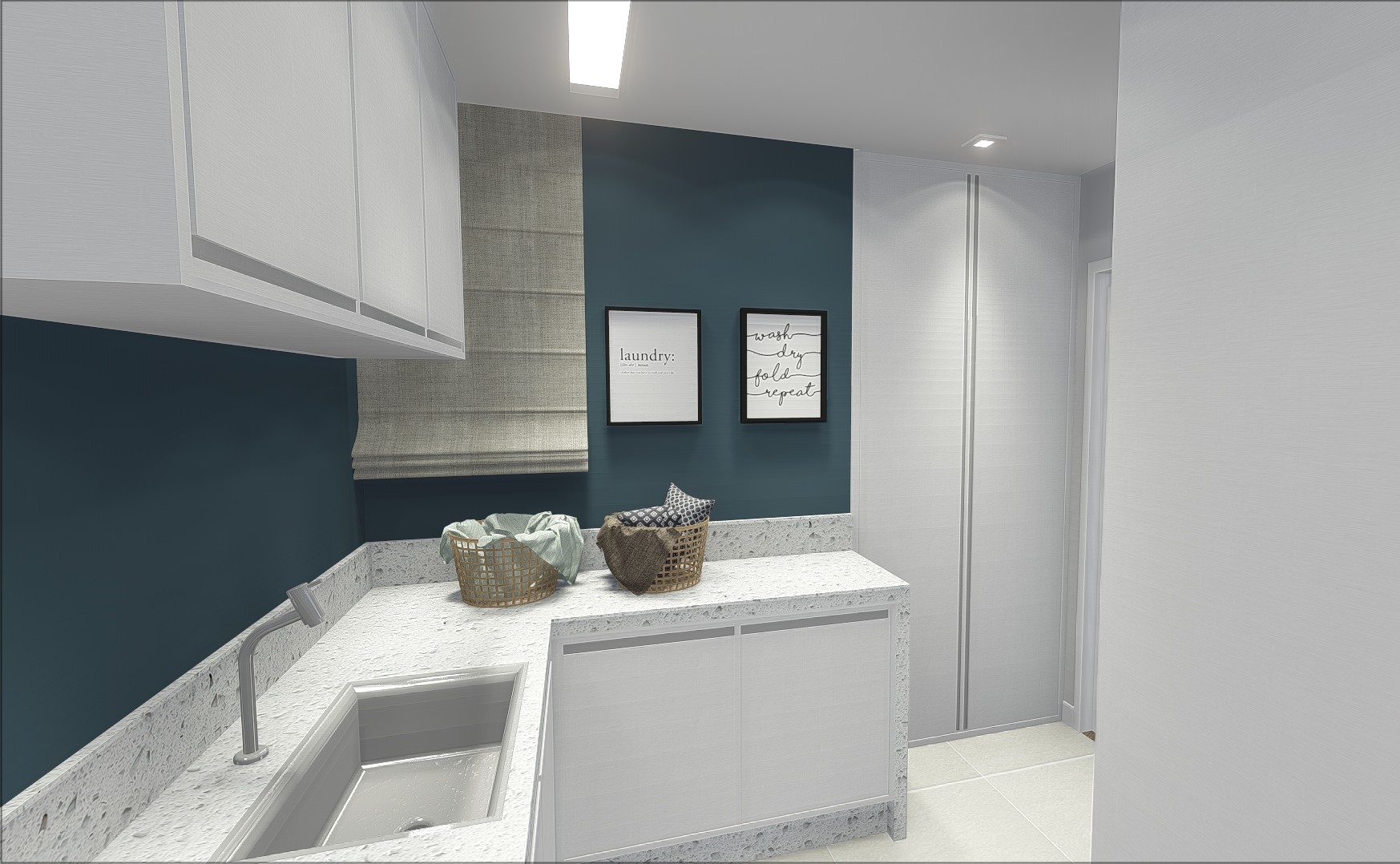 Nesse projeto utilizamos o azul petróleo para contrastar com os móveis brancos.