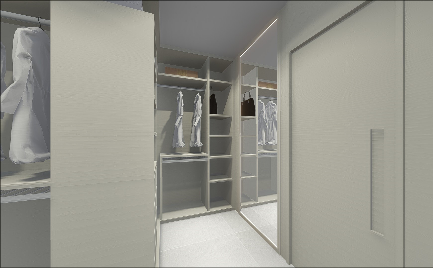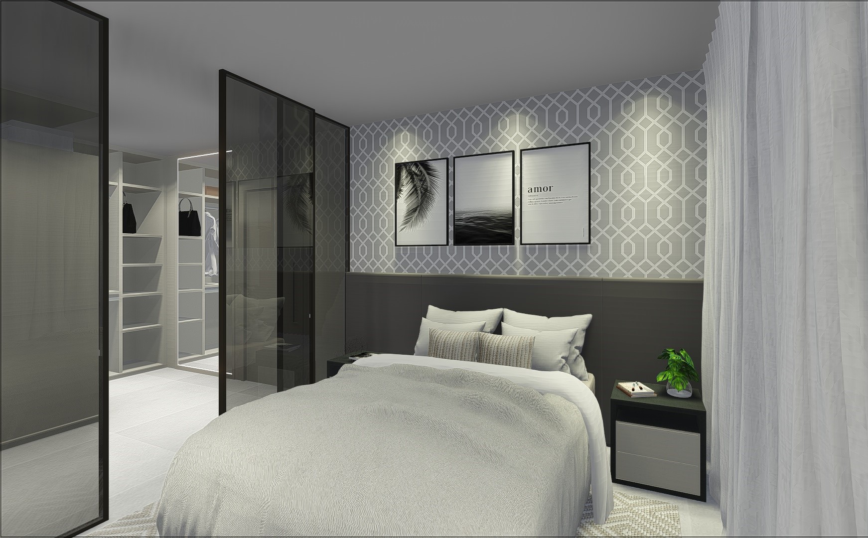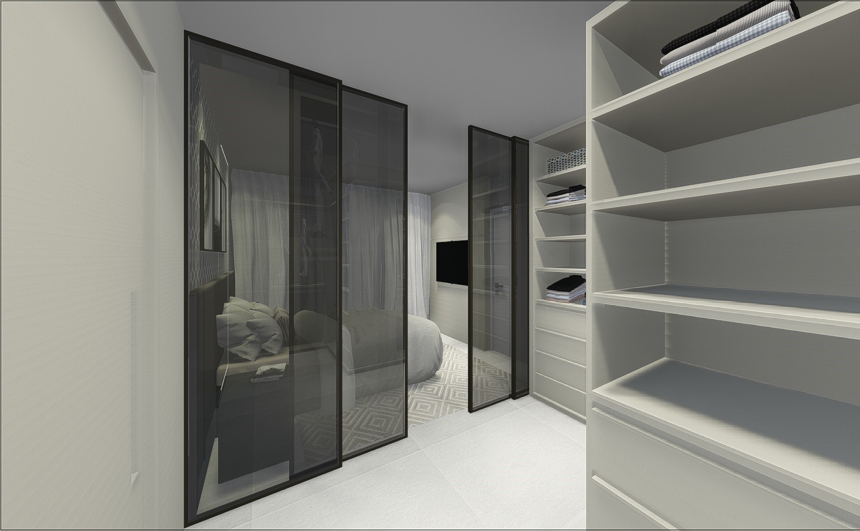 Suíte do casal com acesso ao closet através dessas lindas portas piso teto em vidro fumê. Divisórias do closet em dimensões personalizadas conforme o gosto pessoal do cliente, em mdf clarinho.